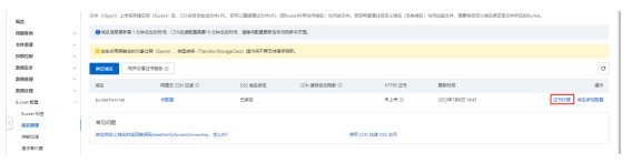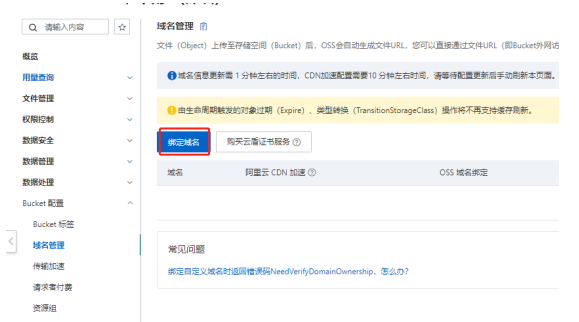第三步,就是上傳提示的“綁定自定義域名”,點擊“bucket配置”->“域名管理”,如下圖所示:然后點擊“綁定域名”