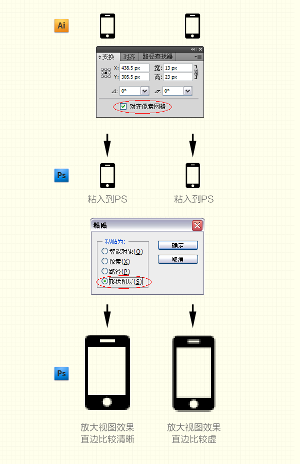 大家在設(shè)計界面和網(wǎng)頁時,是不是經(jīng)常碰到PS里繪制的圖標雖然是矢量的,但還是會有許多虛邊,在放大、縮小、旋轉(zhuǎn)后虛邊變的更嚴重了,或者是在AI里繪制的精美矢量圖標粘到PS里就變虛了,我們辛苦設(shè)計的作品就這樣變”糊了”,這是我們雙眼所不允許的,我們要讓每一個像素都清晰可辨。要解決這些問題就要理解PS像素組成的原理,了解一些設(shè)置選項和使用技巧,下面和大家一塊分享。(PS=Photoshop, AI=Illustrator)