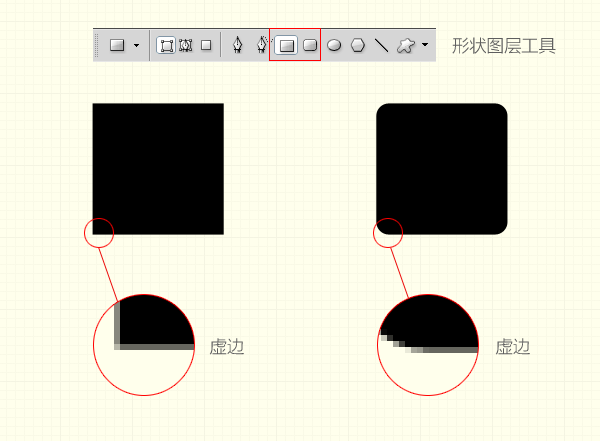 我們通常在PS里繪制矩形時會用 「矩形工具」,這樣產(chǎn)生的是矢量的形狀圖層,它的好處是我們無論放大縮小時都保持矢量屬性,但當我們放大視圖看時還是有虛邊(上圖),這些虛邊雖然在繪制大的圖形時影響不太大,但當我們繪制很小的像素級圖標時,就會很明顯了。
