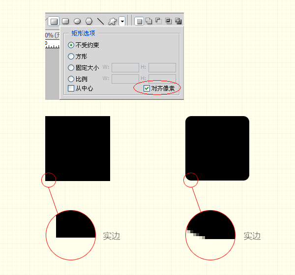 解決方法是選中下圖列出的 「對齊像素」選項,當我們再繪制同樣的矩形時,放大視圖看邊緣就清晰可辨了(下圖)。其中的原理是:我們屏幕顯示的圖像是由無數(shù)個像素組成的,也就是說像素是圖形的更小單位,通常當我們繪制的圖形不是整數(shù)像素時,比如寬是20.5像素,那0.5的像素小于1像素,PS就會以虛邊顯示。當選中[對齊像素]選項時,我們繪制的寬、高將都是整數(shù)了。