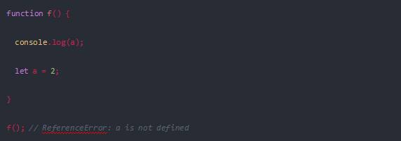 這段代碼直接報(bào)錯(cuò)顯示未定義,let與const擁有類似的特性,阻止了變量提升,當(dāng)代碼執(zhí)行到console.log(a)時(shí),執(zhí)行換將中a還從未被定義,因此產(chǎn)生了錯(cuò)誤.返回。